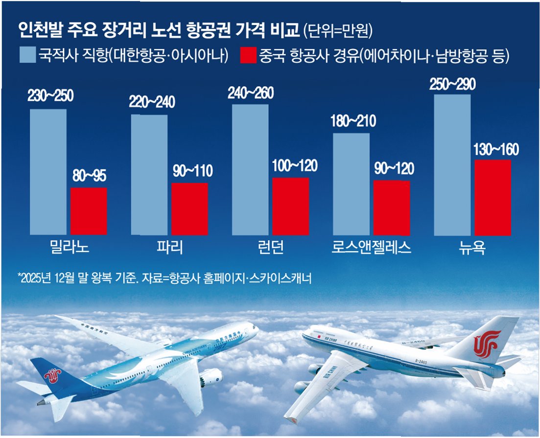 서비스·정책 혜택도 ‘가성비 스펙’에 포함된다. 상하이·베이징 등 주요 공항은 144시간 무비자 환승을 허용한다. 일정 조건 충족 시 무료 환승 호텔도 제공한다. 여기에 지난해 11월부터 시행된 한국인 무비자 입국 조치까지 맞물리면서 단순 환승이 아니라 중국 도시에 며칠 머무는 ‘스톱오버 관광’ 수요가 덤처럼 따라붙는다. 유럽행 특가를 찾다가 ‘베이징 2박+파리 5박’ 같은 일정으로 자연스럽게 갈아타는 패턴이다.