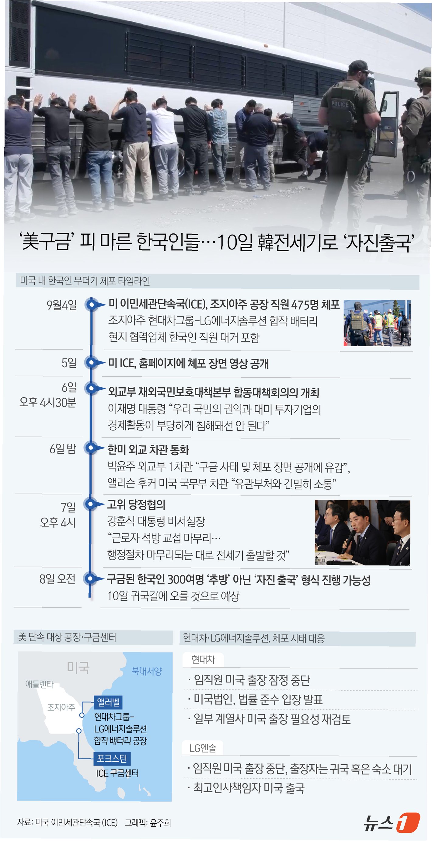 이번 전세기 투입의 배경에는 미국 이민세관단속국(ICE)와 국토안보수사국(HSI)의 단속 작전이 있었습니다. 지난 4일, 이 작전으로 총 475명이 체포되었으며, 이 중에는 LG에너지솔루션 회사 직원 47명(한국 국적 46명, 인도네시아 국적 1명)이 포함되어 있습니다. 또한, 현대엔지니어링 협력업체 직원 168명도 함께 구금된 상황입니다. 구금된 이들의 귀국을 위해, 정부와 기업은 긴밀하게 협력하여 최선을 다하고 있습니다.