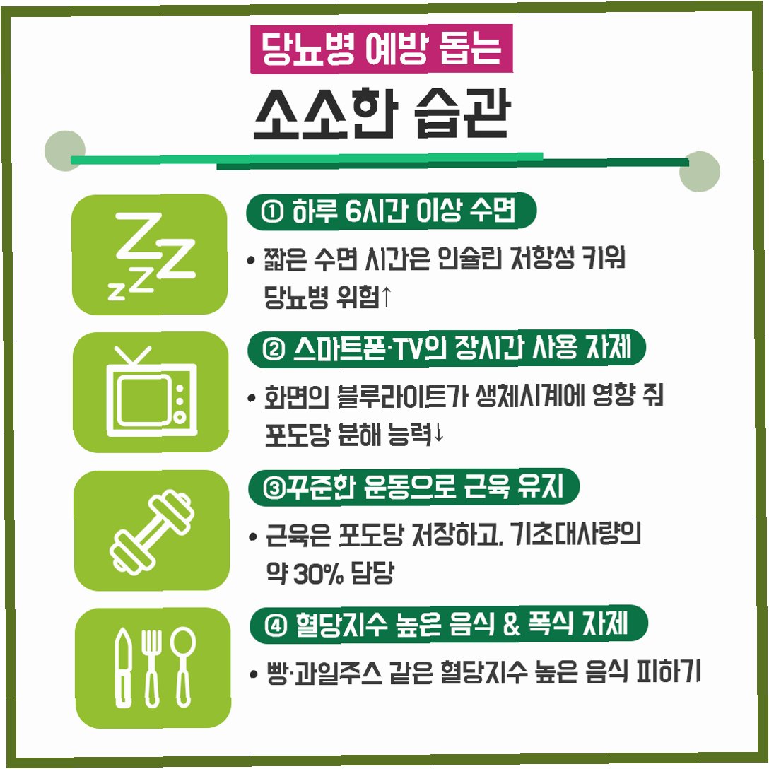 혈당 관리는 규칙적인 식사와 적절한 탄수화물 섭취량, 식이섬유 강화, 충분한 수분 섭취, 수면과 스트레스 관리, 유산소와 근력 운동의 병행이 기본 원칙이다.
