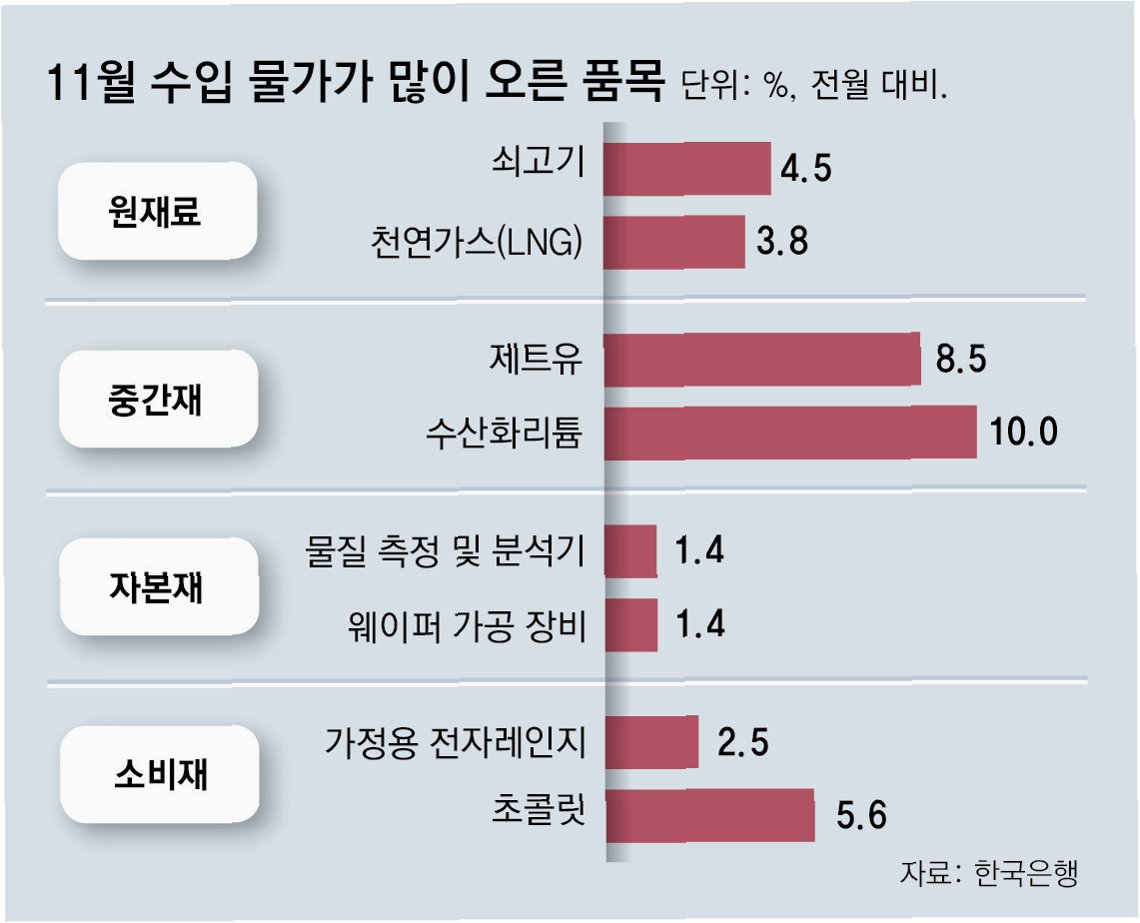 수입물가 상승의 주요 원인은 환율입니다. 12월 두바이유 가격은 배럴당 평균 62.05달러로 전월 대비 3.8% 하락했지만, 같은 기간 원·달러 평균 환율은 1467.40원으로 전월보다 0.7% 올랐습니다. 유가 하락에 따른 수입 가격 인하 효과를 고환율이 상쇄한 셈입니다. 품목별로는 원재료가, 중간재, 자본재, 소비재 할 것 없이 수입 가격이 상승했습니다. 특히, 천연가스(LNG) 등 광산품을 중심으로 원재료 가격이 0.1% 올랐고, 1차 금속제품을 포함한 중간재 가격은 1.0% 상승했습니다.