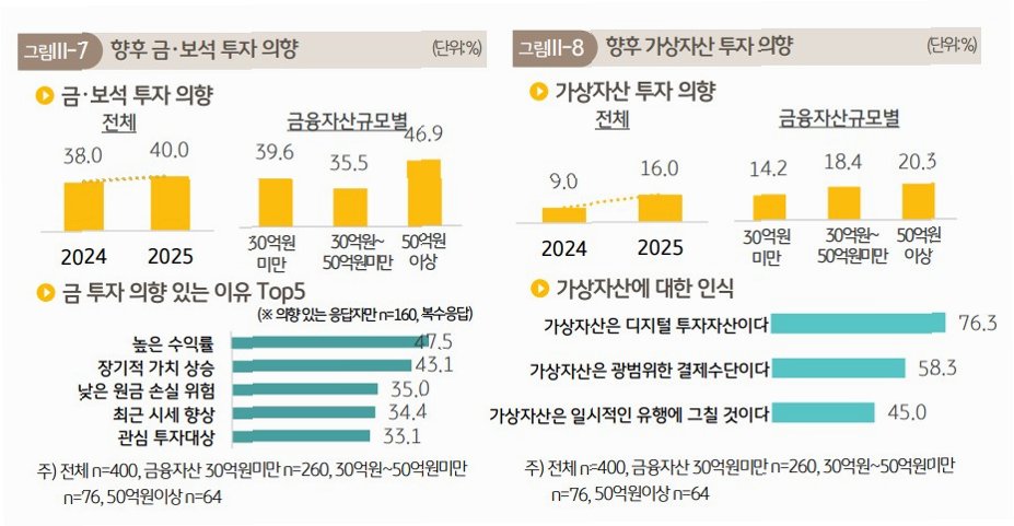 주식 외에도 부자들은 금·보석 등 실물자산에 대한 높은 관심을 보였습니다. 경제 불확실성과 지정학적 리스크가 확대되면서 안전자산으로서의 매력이 재조명된 영향으로 분석됩니다. 보고서는 단기 유망 투자처 조사에서도 기타자산 가운데 금과 보석에 대한 기대가 꾸준히 상승하고 있다고 분석했습니다. 이는 변동성이 큰 시장 상황에서 자산을 안정적으로 유지하려는 부자들의 전략으로 해석됩니다.