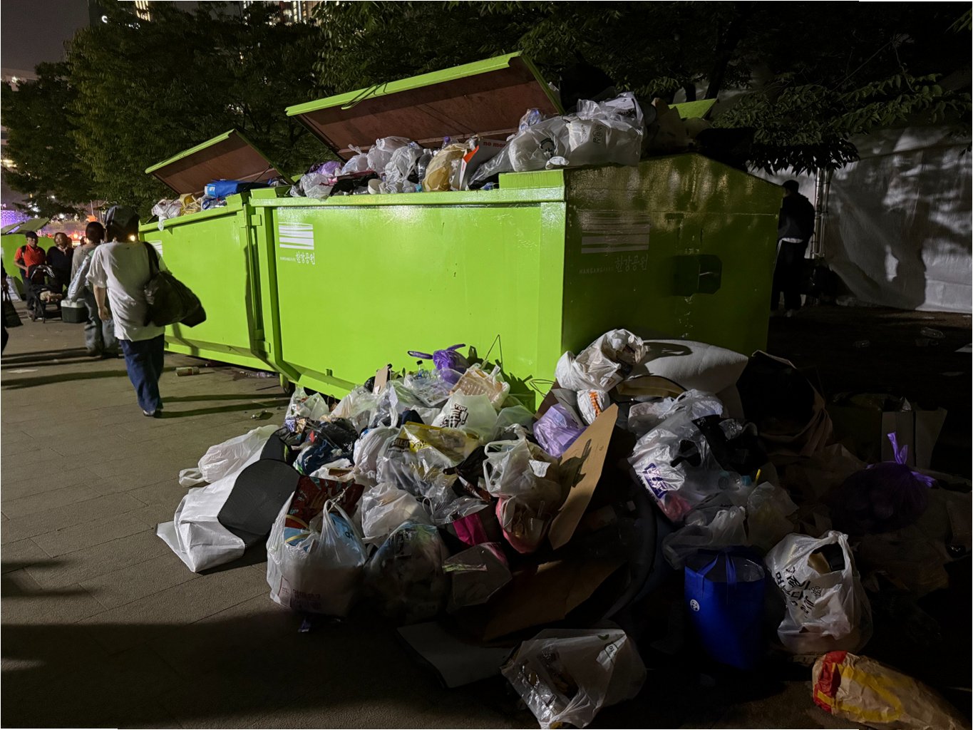 불꽃 축제가 끝난 후, 여의도 일대는 쓰레기 산으로 변했습니다. 사람들이 버리고 간 쓰레기들이 화장실 앞, 벤치, 길거리에 널려 있었고, 심지어는 음식물 쓰레기를 한강 다리 난간에 박아두는 경우도 있었습니다본인이 사용한 쓰레기를 제대로 처리하지 않고 떠나는 무책임한 행동들은 축제의 즐거움을 퇴색시키는 주된 요인으로 작용했습니다.