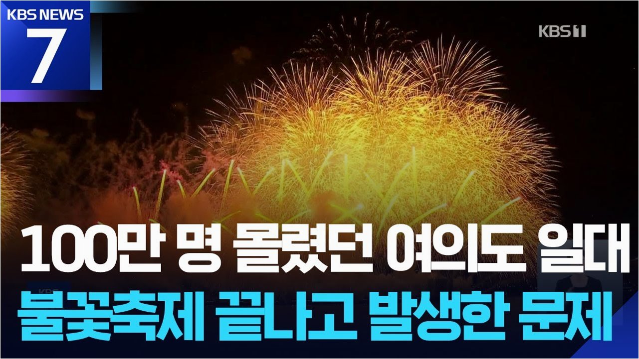어젯밤 서울 여의도에서 열린 불꽃 축제는 100만 명에 달하는 인파를 불러 모으며 성황리에 마무리되었습니다하지만 축제가 끝난 자리에는 눈살을 찌푸리게 하는 모습들이 남아 안타까움을 자아냈습니다화려한 불꽃 아래 가려진 쓰레기 문제, 우리는 이 문제에 대해 다시 한번 생각해 볼 필요가 있습니다.