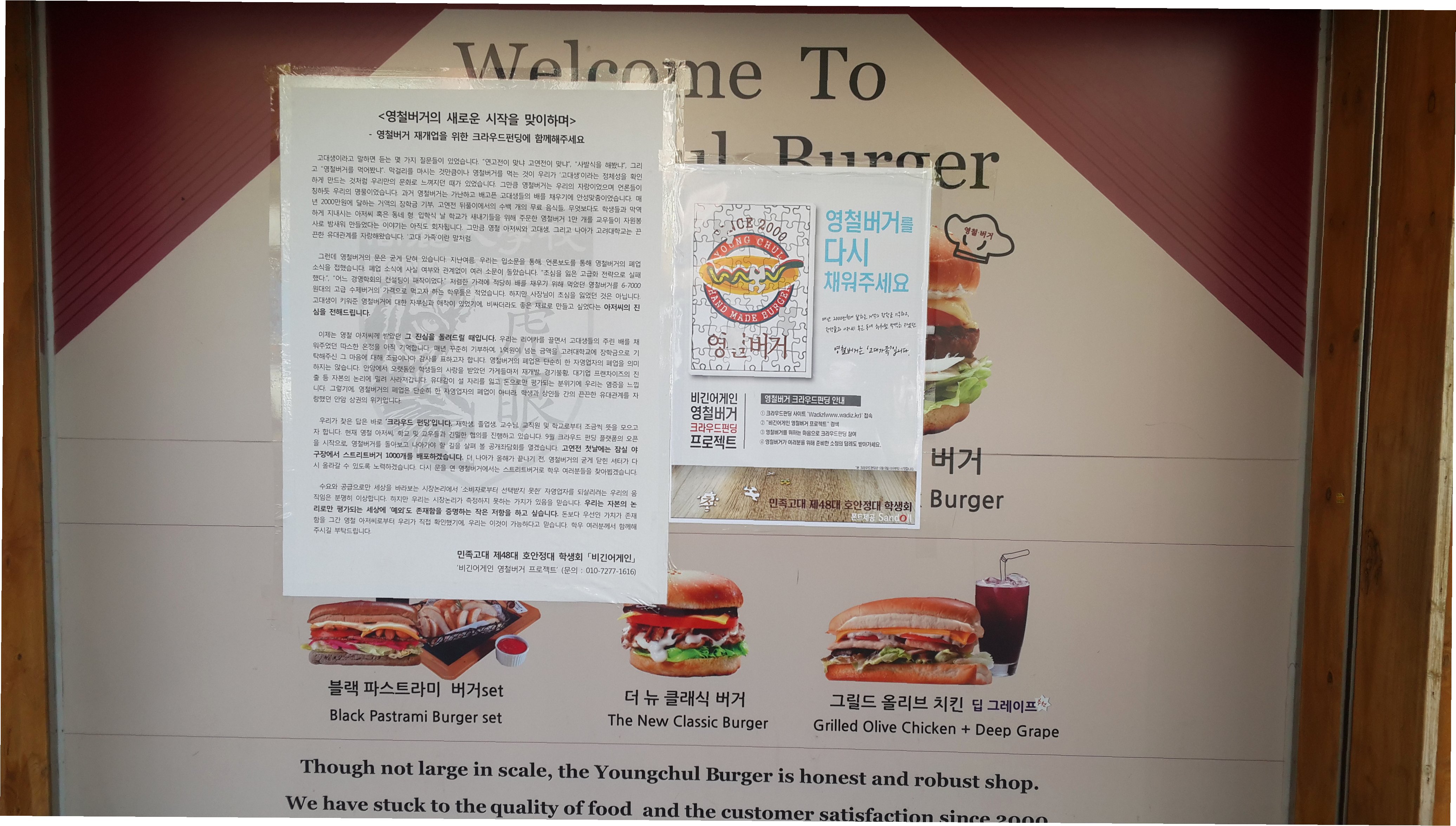 A.영철버거에 대한 애정과, 이영철 사장의 나눔 정신에 감동받은 고대생들이 크라우드 펀딩을 통해 재정적 지원을 했기 때문입니다.