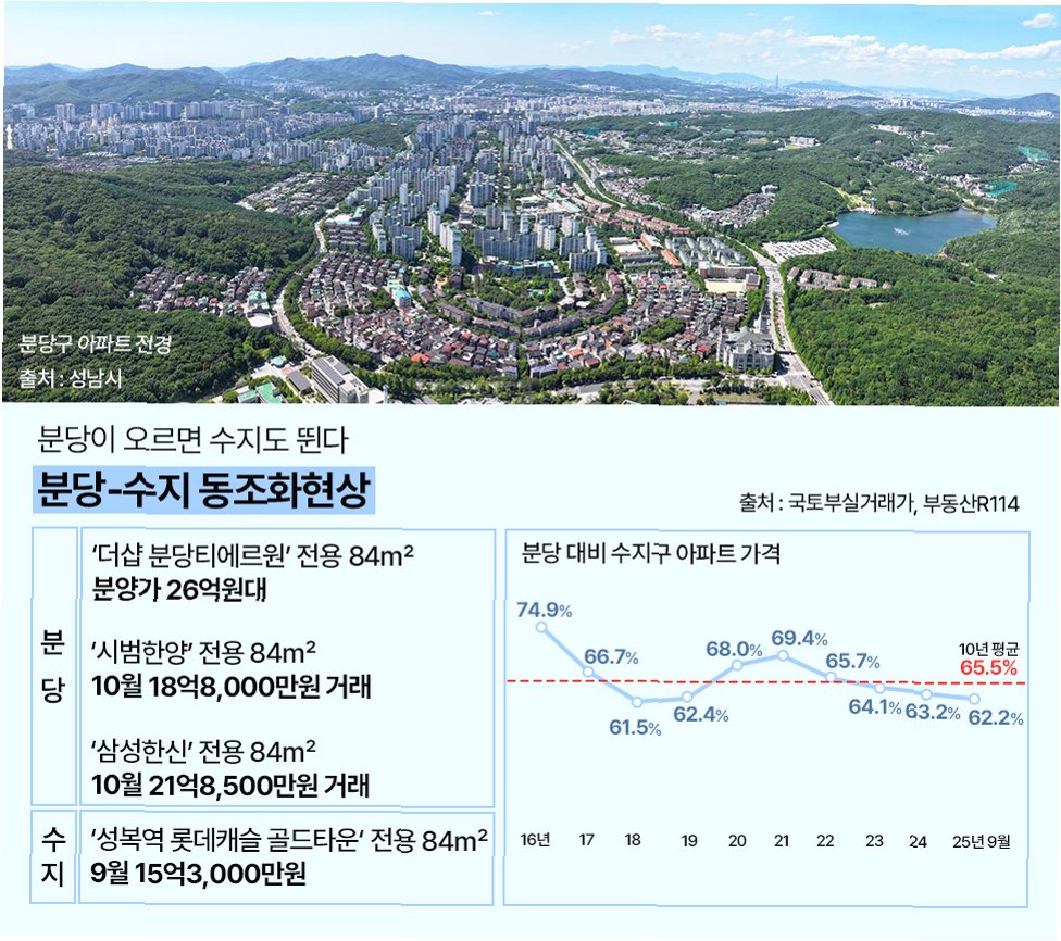 한국부동산원 통계에 따르면 올해 전국에서 가장 높은 상승률을 기록한 곳은 경기 용인 수지구입니다. 연초 이후 1% 중반대의 상승률을 보이며, 작년과 비교해 체감 상승폭이 확연히 달라졌습니다. 특히 수지구의 대장 단지들은 2021년 고점 이후 조정을 거쳤으나, 지난해 말 최고가를 경신하고 올해도 비슷한 수준에서 거래가 이어지고 있습니다. 한 공인중개사는 10년 중개 경험상 작년 초 12억대면 거래가 가능했지만, 지금은 그 가격에선 전화도 잘 오지 않는다며 집주인들의 태도가 '아직 안 팔아요'로 바뀌었다고 설명했습니다.