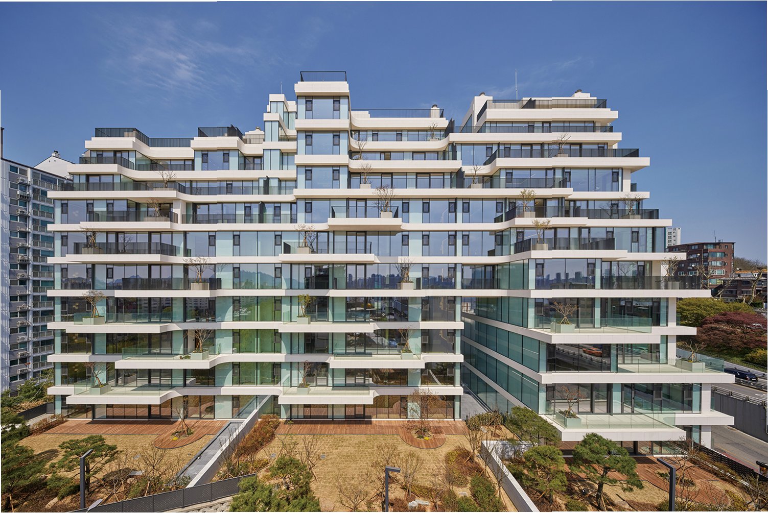 '아페르한강'은 소규모 단지임에도 불구하고 호텔급 컨시어지 서비스와 다양한 커뮤니티 시설을 제공합니다. 피트니스, 필라테스룸, 스크린 골프, 소규모 영화관 등을 이용할 수 있으며, 개인 창고 및 리무진, 하우스 클리닝 서비스까지 제공됩니다. 특히, 각 층이 3개 라인으로 나뉘고 라인마다 엘리베이터가 설치되어 있어 주민 간의 접촉을 최소화하고 철저한 프라이버시를 보장합니다. 언덕 위에 위치하여 외부에서 내부를 볼 수 없도록 설계된 점도 특징입니다.