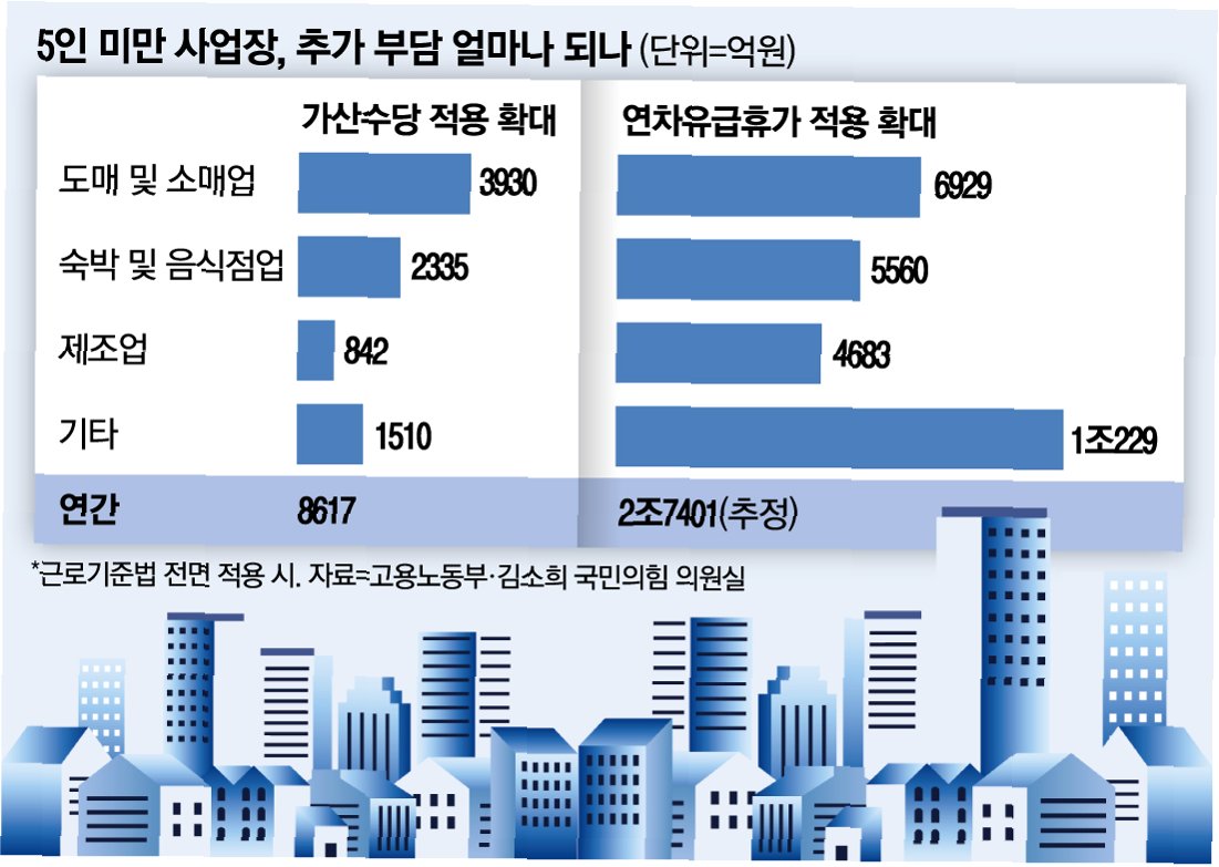 국회 환경노동위원회 소속 김소희 의원이 입수한 고용노동부 연구용역 보고서에 따르면, 가산수당 확대 적용으로만 연간 8617억원의 추가 인건비가 필요할 것으로 전망됩니다또한, 연차 유급휴가 확대 적용에 따른 부담은 무려 2조7401억원에 달할 것으로 예상됩니다. 이러한 수치는 영세 사업장의 재정 상황을 더욱 압박하여, 고용 축소나 폐업으로 이어질 가능성을 높입니다. 이는 결국, 근로자의 일자리 감소로 이어질 수 있다는 점에서 심각한 문제입니다.