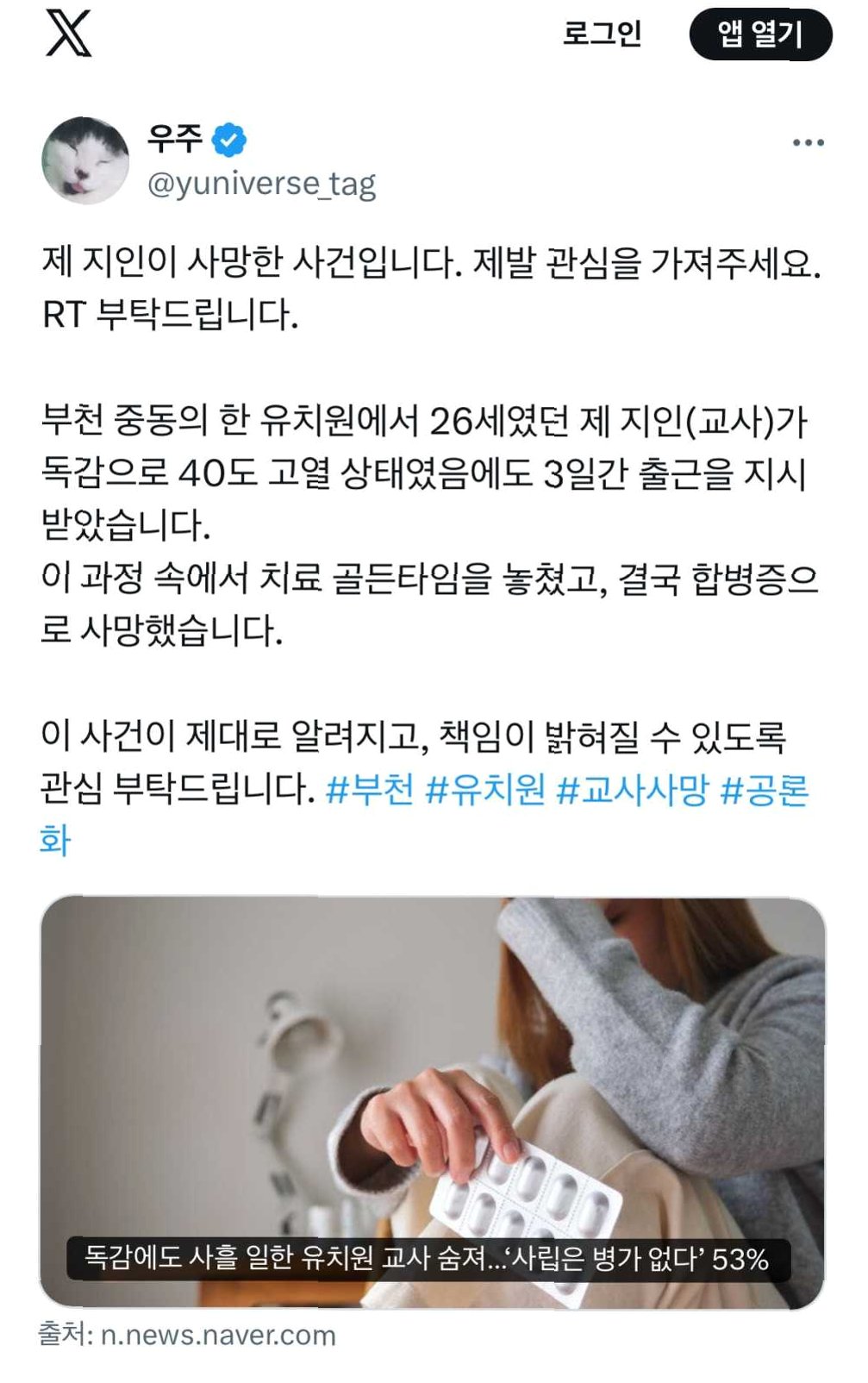 경기 부천의 한 유치원 교사가 고열에도 불구하고 근무를 이어가다 끝내 사망하는 안타까운 사건이 발생했습니다. B형 독감 확진 판정을 받고 39.8도의 고열에 시달렸음에도 불구하고, 학기 말 행사와 대체 인력 부재라는 현실 속에서 근무를 강행해야만 했습니다. 이는 개인의 문제가 아닌, 열악한 노동 환경이 낳은 구조적인 문제라는 지적이 제기되고 있습니다.