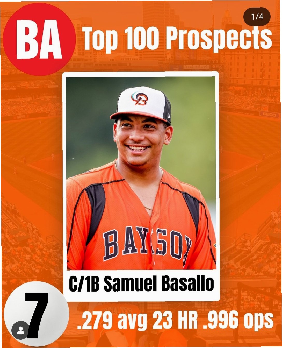 사무엘 바사요는 'MLB 파이프라인' 기준 포수 포지션 랭킹 1위, 전체 포지션 랭킹 8위에 빛나는 특급 유망주입니다. 2004년생으로, 지난주 생일을 맞이하며 21세 시즌을 시작했습니다. 그는 타격과 파워에서 메이저리그 평균 이상의 잠재력을 보여주고 있으며, 특히 강한 어깨는 리그 최상위권으로 평가받고 있습니다. 마이너리그에서의 활약은 그의 잠재력을 더욱 돋보이게 합니다. 이번 시즌 볼티모어 산하 트리플A 팀에서 76경기에 출전하여 타율 0.270, 23홈런, 67타점, OPS 0.966을 기록했습니다. 특히, 장타율이 무려 0.589에 달하며 엄청난 파워를 과시했습니다. 이러한 압도적인 성적은 그가 메이저리그에서 성공할 수 있을 것이라는 기대감을 높이는 데 충분했습니다.