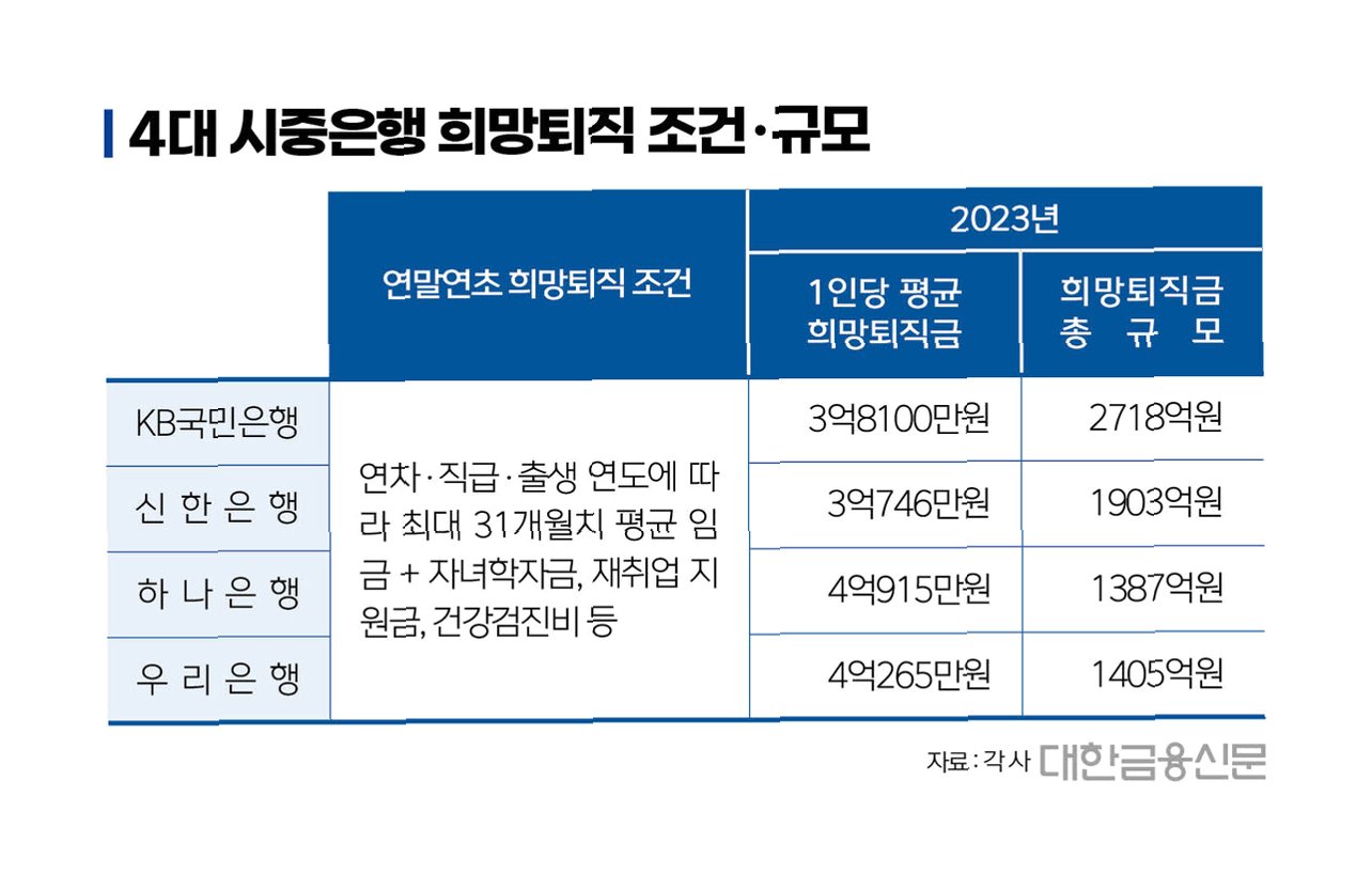 직원 입장에서 보면 “은행 수익이 많이 나 조금이라도 더 챙겨줄 때 나가 인생 2막을 준비하자”는 심리도 영향을 미친 것으로 보인다. 실제 희망퇴직 보상 조건은 과거 최대 36개월치 수준에서 최근 20~31개월치 수준으로 줄어들며 특별퇴직금이 점점 줄어드는 추세에 있다.