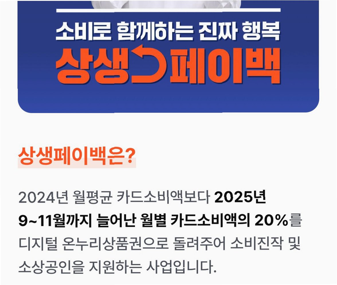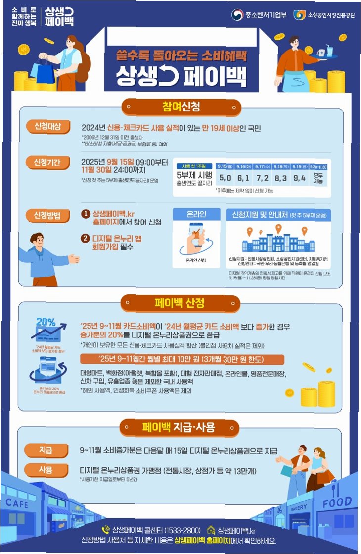 '상생페이백'은 만 19세 이상 국민을 대상으로, 작년 월평균 카드 소비액보다 올해 9월부터 11월까지 월별 카드 소비액이 늘어난 경우, 증가액의 20%를 환급해주는 사업입니다. 월 최대 10만원, 3개월간 총 30만원까지 환급받을 수 있으며, 전통시장 및 상점가 등에서 사용할 수 있는 디지털 온누리 상품권으로 지급됩니다. 이 혜택을 받기 위해서는, 먼저 신청 기간 내에 신청을 완료해야 합니다. 신청 결과는 이틀 후에 알림톡으로 안내될 예정이며, 9월 1일부터의 누적 카드 실적은 18일부터 상생페이백 누리집에서 확인할 수 있습니다.