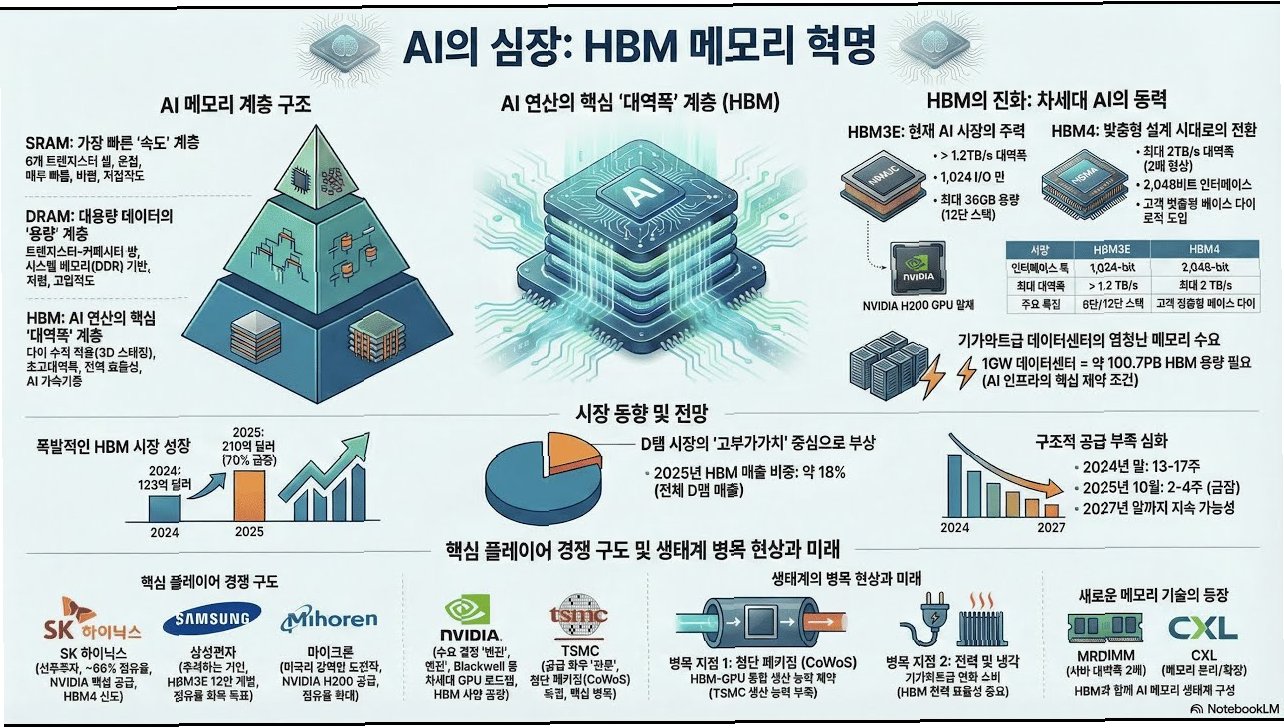AI 시대의 도래와 함께 메모리 부족 현상이 심화되고 있으며, 이는 삼성전자와 SK하이닉스의 역대급 실적 달성에 결정적인 기여를 했습니다. 고부가 메모리 수요 증가와 가격 상승이 실적을 견인했으며, 특히 HBM은 AI 수요의 핵심으로 떠올랐습니다. 메모리 시장의 중심이 AI 서버로 재편되면서 공급 부족 우려는 더욱 커지고 있으며, 고객사들은 물량 확보에 총력을 기울이고 있습니다.