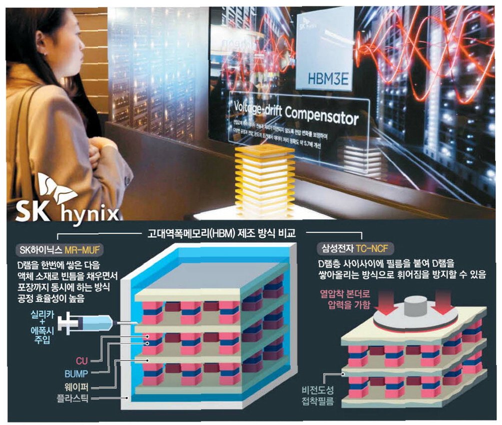 A.HBM(고대역폭메모리)은 기존 D램 여러 개를 쌓아 올려 데이터 처리 속도를 획기적으로 높인 메모리입니다. AI 가속기의 성능을 극대화하는 데 필수적이어서 수요가 폭증하고 있습니다.