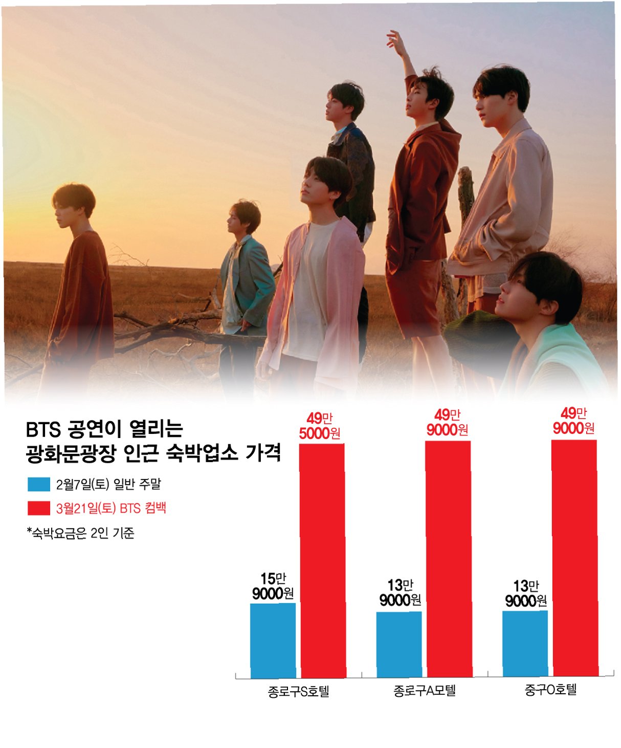 방탄소년단의 컴백 라이브 공연을 앞두고 서울 시내 일부 숙박업소들이 과도하게 요금을 인상해 논란이 되고 있습니다. 공연 당일인 21~22일에는 1박에 8만원이던 요금이 24만원으로 3배 가까이 뛰었고, 고급 호텔뿐만 아니라 게스트하우스와 모텔까지 40만~50만원의 요금을 제시하는 경우도 있었습니다. 이는 외국인 관광객들에게 큰 당혹감을 안겨주고 있습니다.