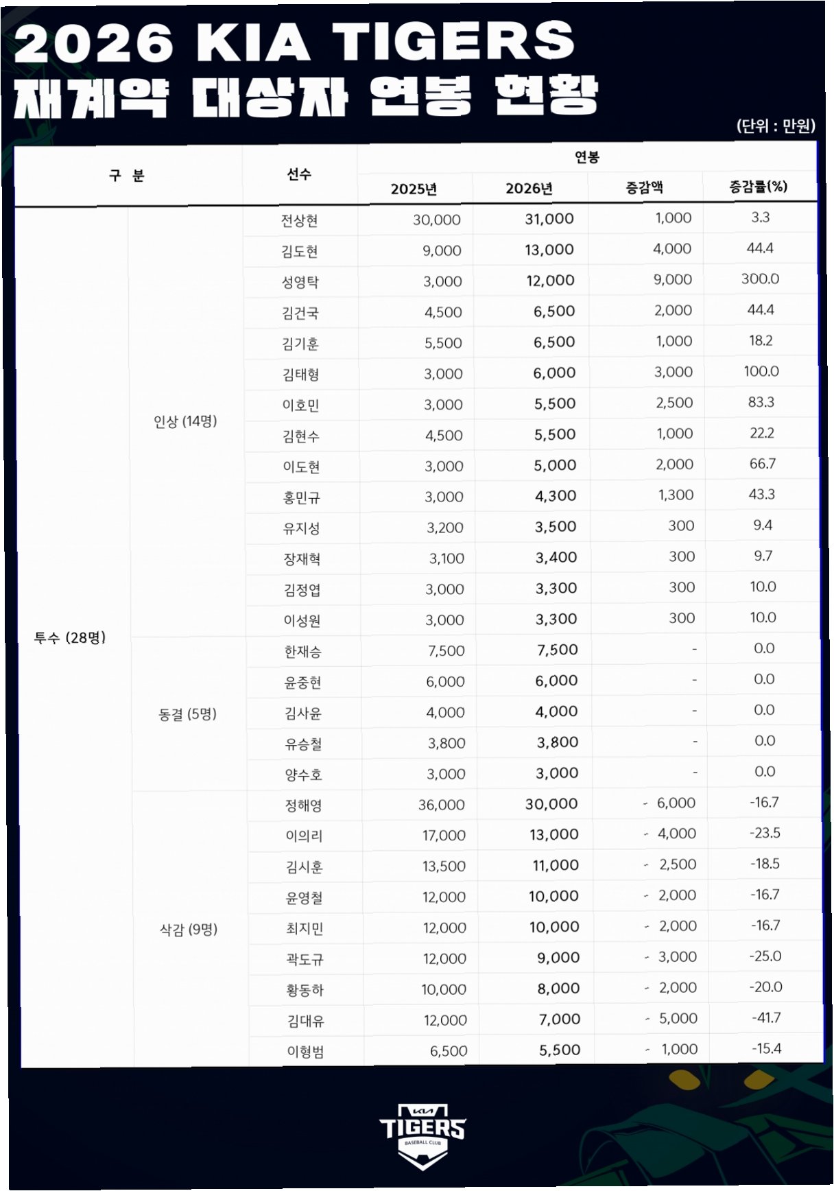 팀 마무리 정해영은 3억6000만 원에서 6000만 원 삭감된 3억 원에 계약했습니다. 정해영은 7번의 블론세이브와 7번의 패전을 기록하는 등 예년보다 부진한 모습을 보였습니다. 팔꿈치 부상으로 복귀한 이의리 역시 1억7000만 원에서 4000만 원 삭감된 1억3000만 원에 도장을 찍었습니다. 윤영철, 최지민, 곽도규, 황동하 등도 억대 연봉에서 삭감되며, 냉정한 평가가 이어졌습니다.