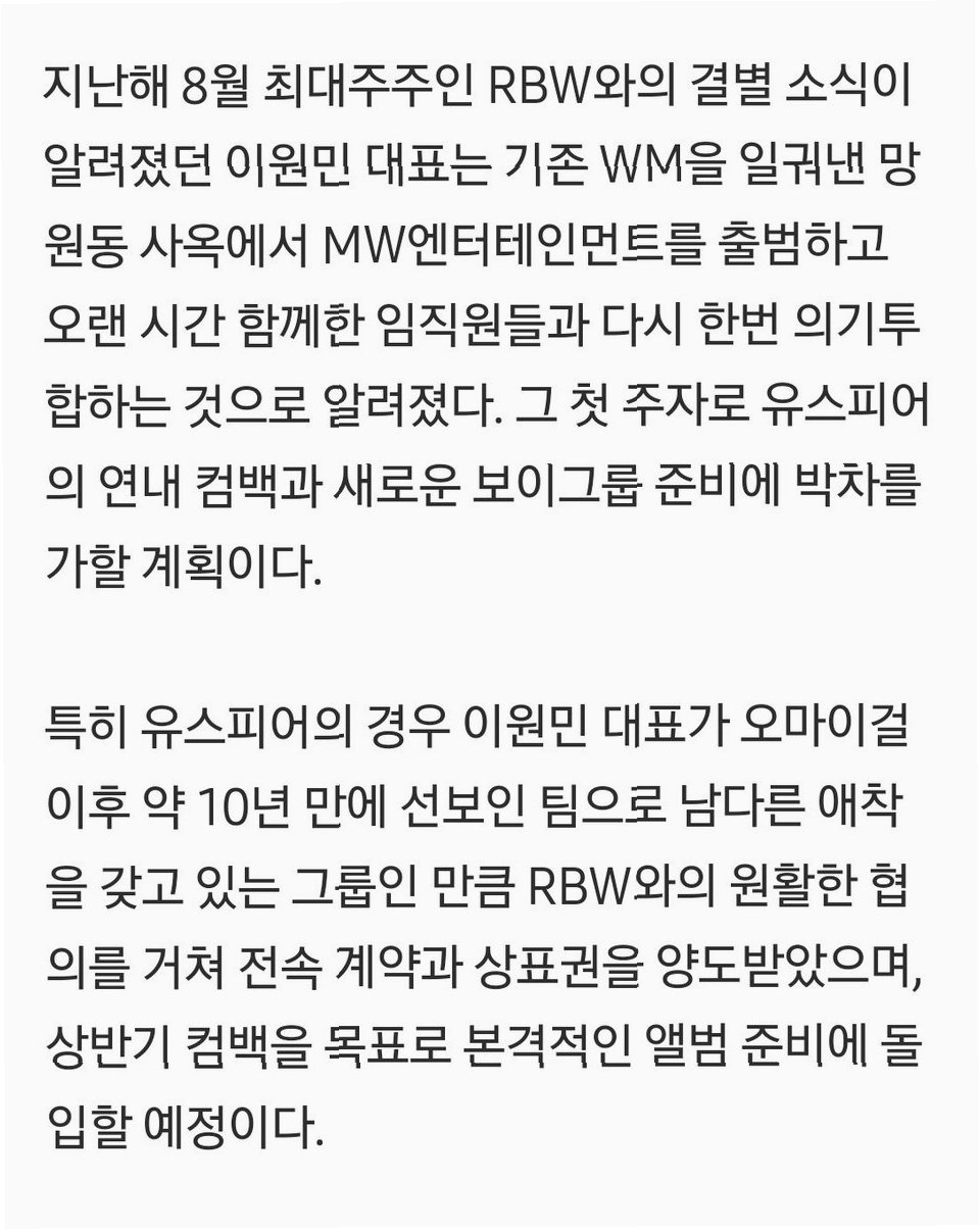 MW엔터테인먼트의 첫 번째 프로젝트는 유스피어의 컴백입니다. 이원민 대표가 오마이걸 이후 약 10년 만에 선보이는 팀인 만큼, 유스피어에 대한 그의 애착은 남다릅니다. RBW와의 원활한 협의를 통해 전속 계약과 상표권을 양도받았으며, 상반기 컴백을 목표로 앨범 준비에 박차를 가하고 있습니다. 유스피어의 컴백은 MW엔터테인먼트의 성공적인 데뷔를 알리는 중요한 신호탄이 될 것입니다.