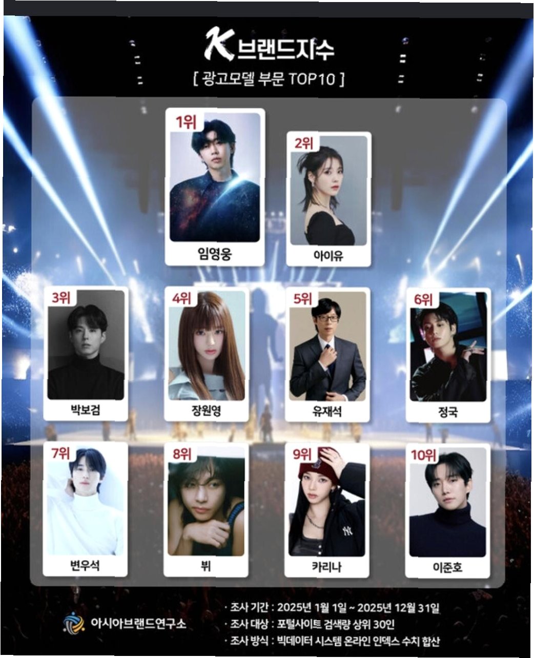 임영웅에 이어 가수 아이유가 2위, 배우 박보검이 3위를 기록하며 톱3에 이름을 올렸습니다. 이 외에도 장원영, 유재석, 정국, 변우석, 뷔, 카리나, 이준호 등 국내 최정상급 스타들이 TOP10에 포함되어 광고계의 뜨거운 인기를 실감케 했습니다.