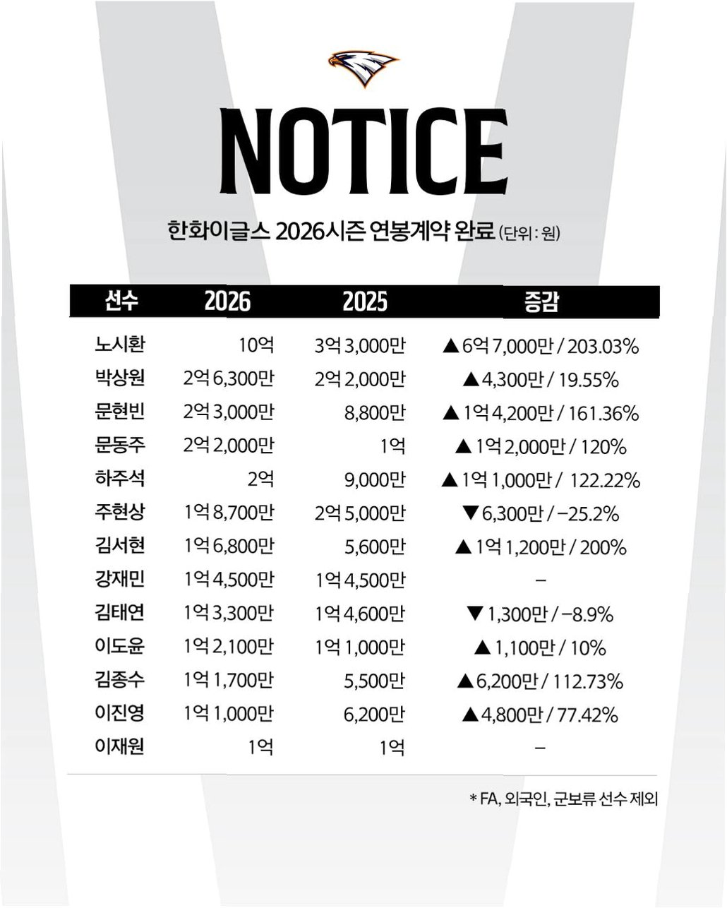 한화 이글스의 거포 노시환 선수가 KBO 리그 역대급 연봉 계약에 이어 비FA 다년 계약이라는 대형 뉴스를 예고하며 야구계를 뒤흔들고 있습니다. 한화 구단은 최근 노시환 선수와 2026시즌 연봉 10억 원에 계약했다고 공식 발표했습니다. 이는 지난해 연봉 3억 3,000만 원에서 무려 6억 7,000만 원(인상률 203%)이 폭등한 금액으로, 구단 역사상 단일 시즌 최고 인상액입니다.