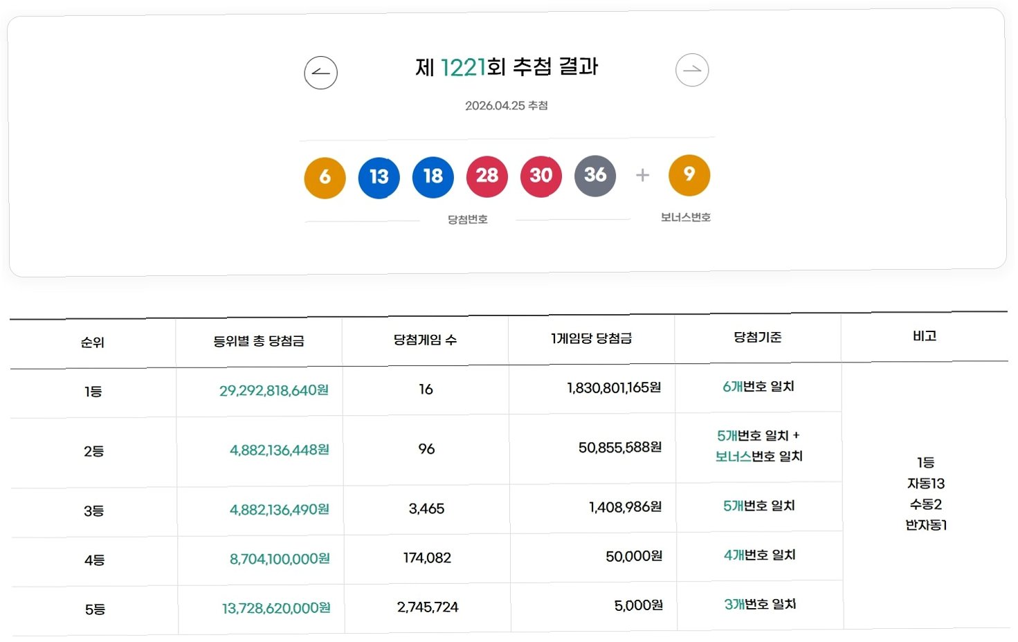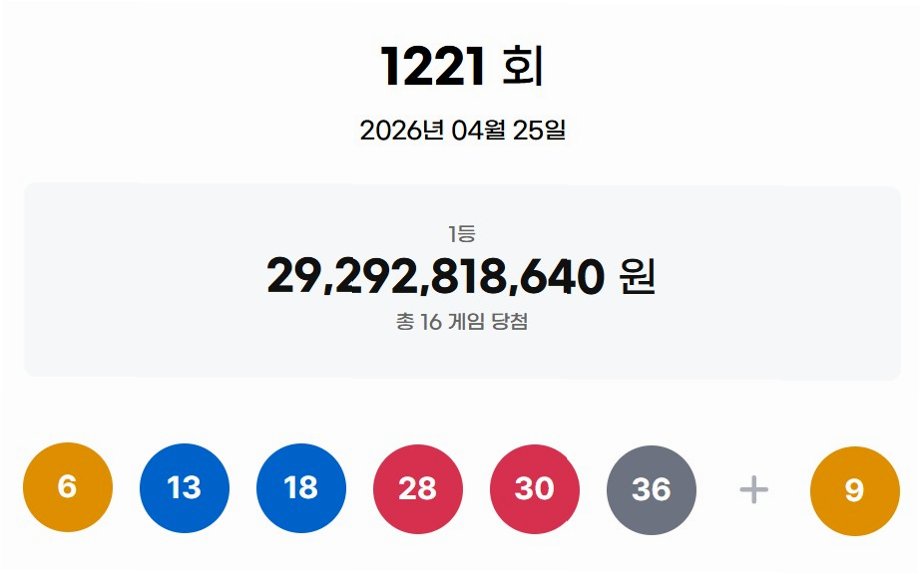 제1221회 로또 추첨 결과, 1등 당첨 번호는 6, 13, 18, 28, 30, 36이며 보너스 번호는 9로 발표되었습니다. 이번 회차에서는 총 16명의 1등 당첨자가 탄생했으며, 각 당첨자는 18억 3080만원이라는 막대한 금액을 수령하게 됩니다. 이는 많은 이들에게 꿈과 희망을 안겨주는 결과입니다.