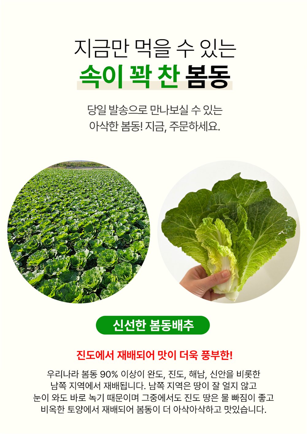 봄동은 겨울철 추위를 이겨내고 자라는 배추의 한 종류로, 주로 전남 완도와 진도 등 따뜻한 서남해안 지역에서 재배됩니다. 9월 말에서 10월에 파종하여 12월부터 이듬해 3월까지 수확하는 봄동은 일반 배추에 비해 잎이 훨씬 부드럽고 단맛이 강한 것이 특징입니다. 이러한 부드러움과 달콤함 덕분에 겉절이나 비빔밥 재료로 많은 사랑을 받고 있습니다.