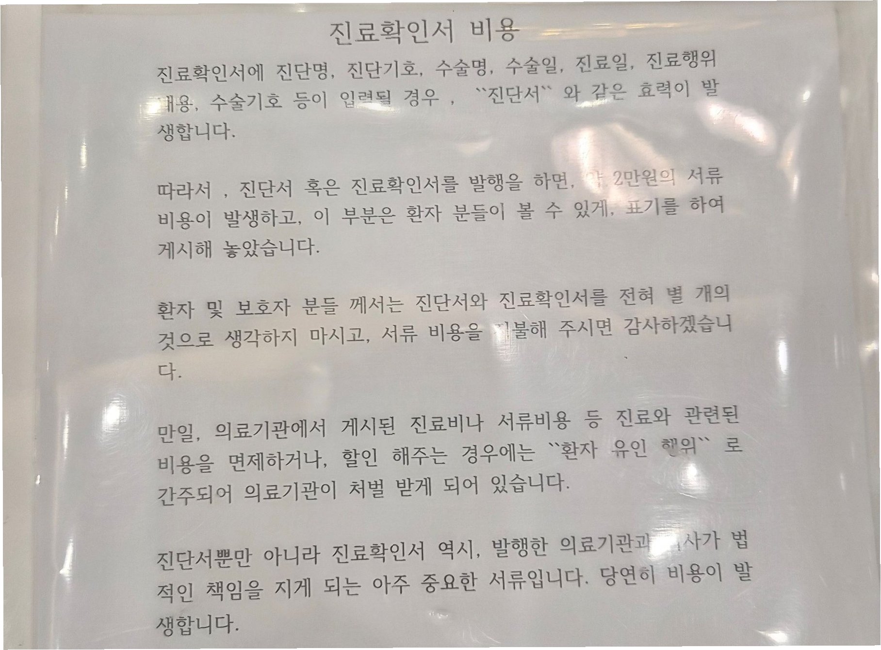 병원마다 제증명 수수료가 제각각이라는 점은 환자들의 불만을 더욱 키우고 있습니다. 남인순 더불어민주당 의원이 공개한 자료에 따르면, 전국 의료기관의 일반 진단서 발급 비용 최고액은 20만원으로 고시 상한액의 10배에 달했습니다. 통원·진료 확인서 역시 일부 기관에서 20만원을 받아 상한선의 67배에 달하는 경우도 있었습니다. 경기도 성남의 한 의원은 진단서와 진료확인서 비용으로 각 20만원을 요구한 사례도 있습니다. 이는 환자들에게 불필요한 경제적 부담을 지우는 행위입니다.
