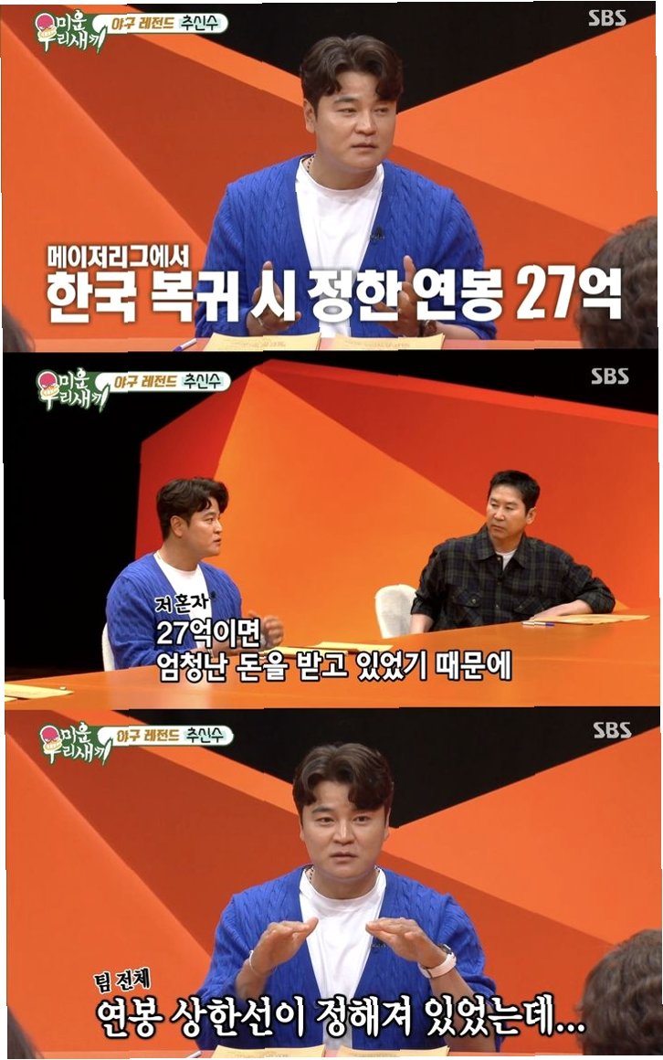 전 야구선수 추신수가 SBS 예능 '신발 벗고 돌싱포맨'에 출연하여 솔직한 입담을 과시했습니다. 그는 다음 생에는 혼자 살고 싶다는 생각과 함께, 아내 하원미 씨의 '돈 자랑'에 대한 솔직한 심정을 털어놓아 많은 이들의 관심을 받았습니다.