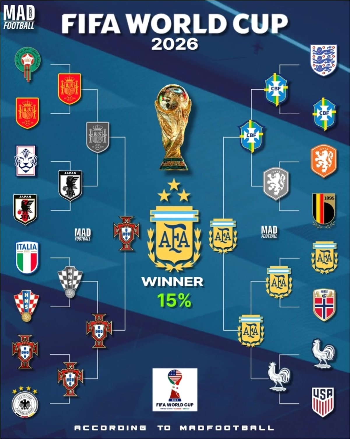 챗GPT의 예측에 따르면, 스페인은 준결승에서 포르투갈에게 패배하고, 아르헨티나는 브라질을 꺾고 결승에 진출합니다. 결국 결승전에서는 아르헨티나와 포르투갈이 맞붙게 되며, 챗GPT는 아르헨티나가 포르투갈을 꺾고 월드컵 2연패를 달성할 것으로 예상했습니다. 이는 지난 카타르 월드컵의 영광을 재현하려는 아르헨티나의 강력한 의지를 반영한 예측입니다.