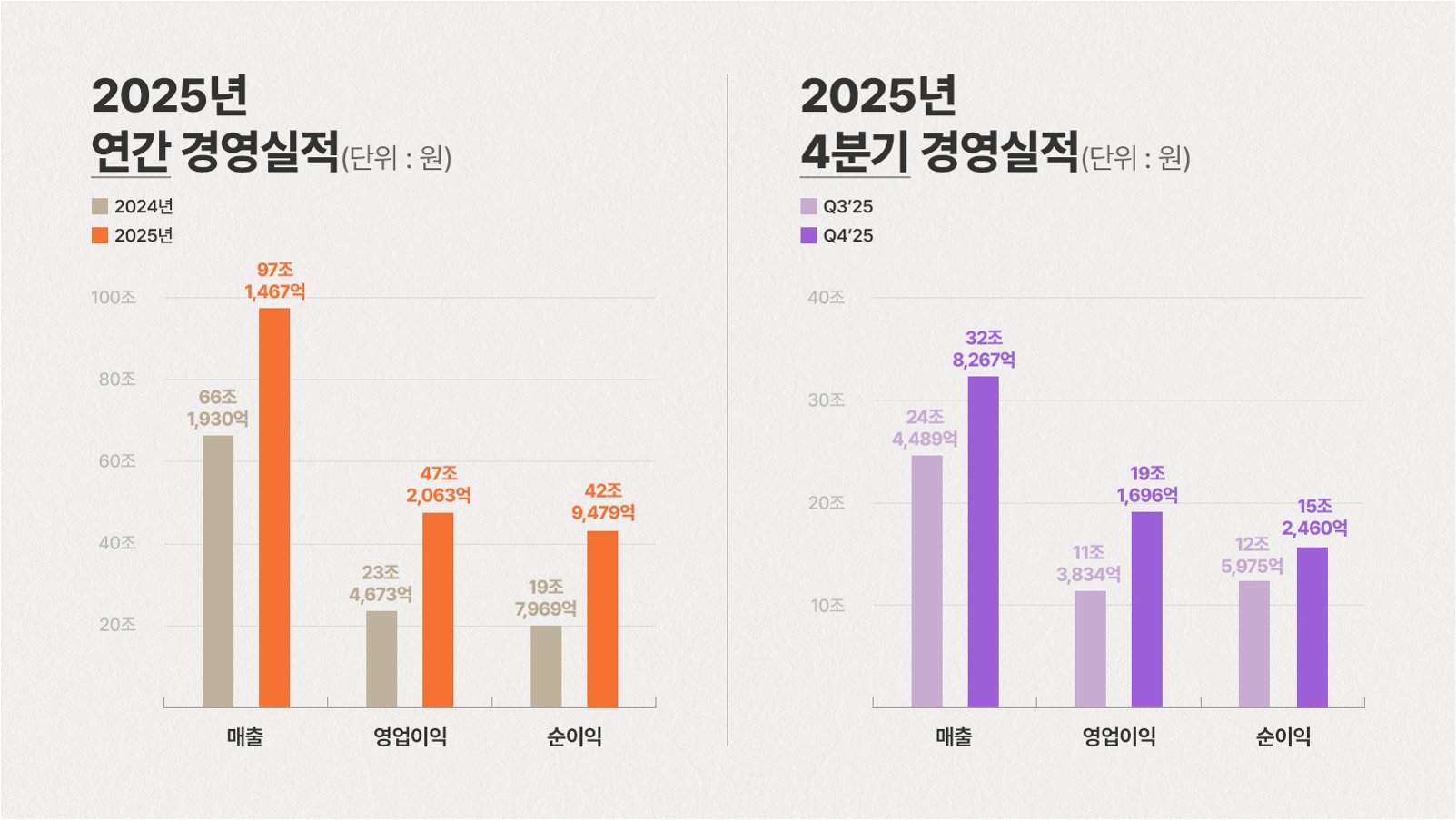 AI 반도체 열풍, SK하이닉스 실적 견인SK하이닉스가 인공지능(AI) 반도체 수요 급증에 힘입어 지난해 4분기 매출 32조 원, 영업이익 19조 원을 돌파하는 역대급 성과를 달성했습니다. 4분기 매출액은 전년 동기 대비 66.1% 증가한 32조 8,267억 원, 영업이익은 137.2% 증가한 19조 1,696억 원을 기록했습니다. 특히 영업이익률은 58%로, 2018년 3분기 기록을 넘어서며 역대 최고치를 경신했습니다. 이러한 호실적은 AI 중심으로 재편되는 수요 구조에 맞춰 기술 경쟁력을 강화하고 고부가가치 제품 비중을 확대한 전략적 대응의 결과입니다. 연간 실적, 삼성전자마저 추월한 '역대 최고'SK하이닉스의 연간 매출액은 97조 1,467억 원으로 46.8% 증가했으며, 영업이익은 101.2..